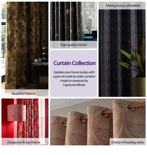 At Capricorn Blinds we offer an extensive collection of some of the most beautiful curtains in the West Midlands. Curtains are a soft and warm furnishing for your windows that creates an inviting and relaxed atmosphere in the room. They are a superb window furnishing to help with light control as well as adding a luxurious feel to the décor of the room. We have an extensive collection of beautiful high quality fabrics available, including traditional and modern prints reflecting the latest home interior trends to gorgeous plains and vibrant colours for any interior imaginable.